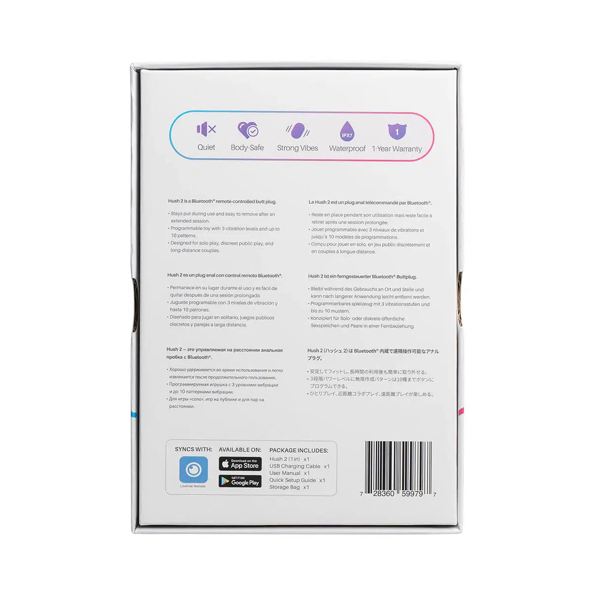Hush 2 - The most versatile vibrating butt plug - EVER! Designed for your comfort. 100% Silicone. Spirals on the neck trap lube near your sphincter - making it easy to remove after an extended session! Neck was carefully designed and tested to ensure it STAYS PUT during use. Optimized base is comfortable, but flared enough to ensure it's safe. Nearly silent when inserted. One Year Warranty.