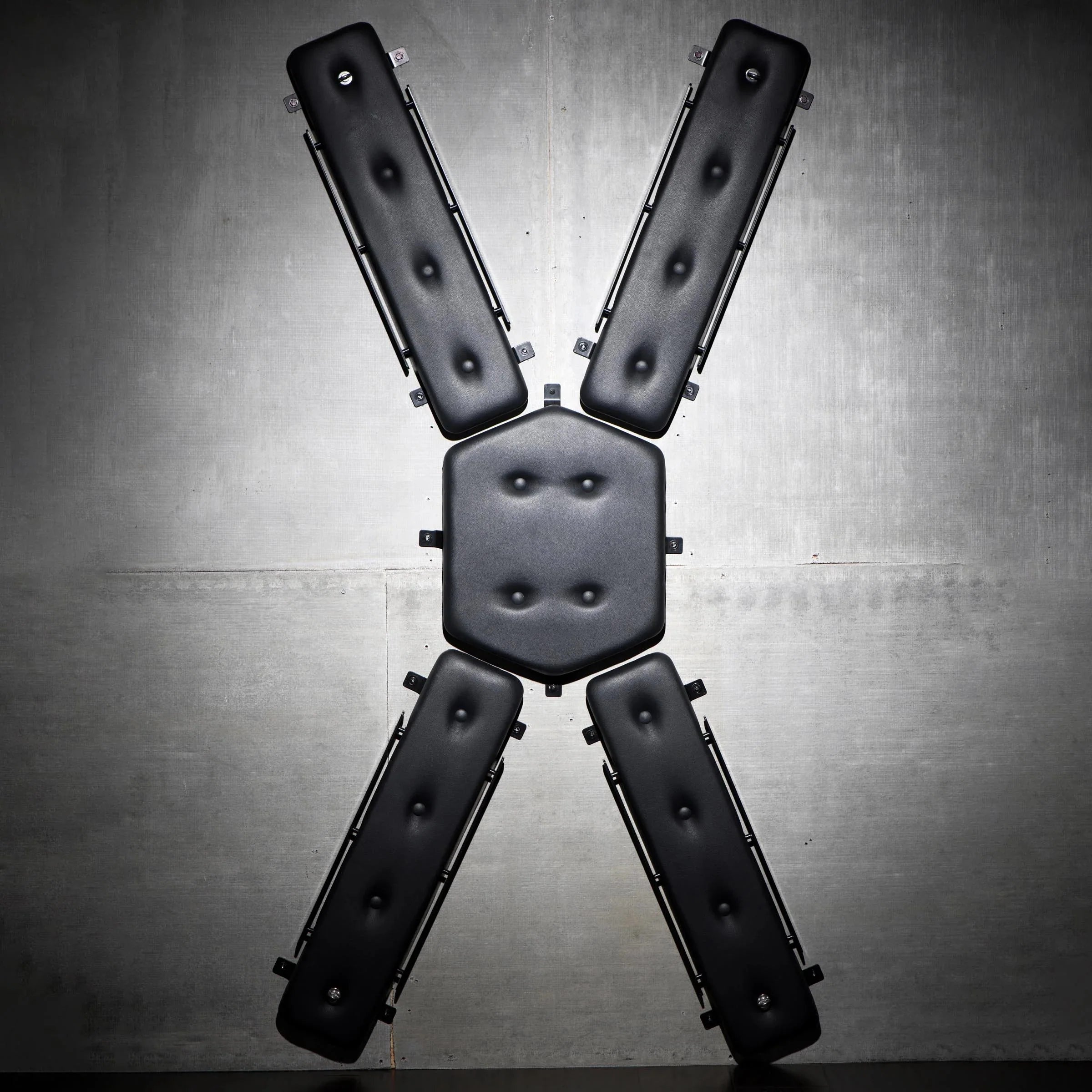 Optimize your kinky play with this wall-mounted St. Andrew's Cross! This plush, padded cross lays flat against the wall so you have more floor space! It's perfect for smaller rooms and gives you more square footage to place other kinky pieces in the room along with the cross. It's also great for rooms that have dual use such as a bedroom where you can hide a cross behind a curtain or dresser. The cross comes in 5 separate pieces and is shipped in a flat package discreetly to your address! Assemble it with the help of a drill and stud finder and place the 5 pieces exactly at the height that you prefer for easy and ergonomic scenes. The ultra plush pads are covered in PVC faux leather, are extra comfortable and easy to clean with a toy cleaner or isopropyl alcohol spray. Along the sides of each leg and arm pad are attachment points where you can attach wrist and ankle cuffs, rope, or other kink accessories! Get your submissive to stand upright for impact play whenever you like with this easy to install, easy to hide and compact St. Andrew's Cross!